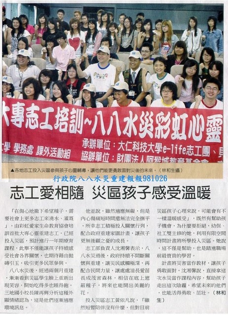 首批成軍的八八水災彩虹心靈重建志工,由屏東縣大仁科技大學近一百名學生組成,大仁科大幼保系大四的女同學黃依凡說,雖然服務的學校離家有一段距離,每周要定期上山並不容易,但她說:「如果因為自己小小的力量卻能讓那些孩子得到快樂、有所收獲,那是件多令人感到快樂的事情,為甚麼要拒絕?」她相信,在這過程中,有所收穫的不只是那些孩子,自己也必能成長許多。