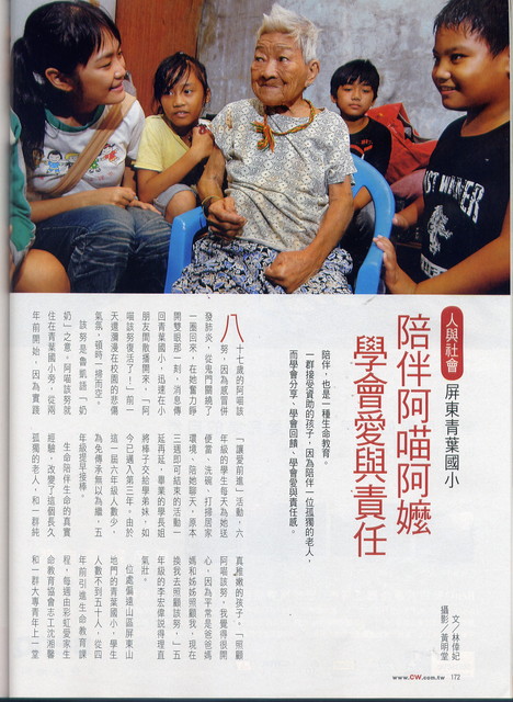 生命陪伴生命的真實經驗,改變了這個長久孤獨的老人,和一群純真稚嫩的孩子。「照顧阿喵該努,我覺得很開心,因為平常是爸爸媽媽和姊姊照顧我,現在換我去照顧該努,」五年級的李宏偉說得理直氣壯。