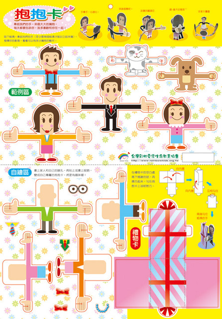 手牽著手,來個大大的擁抱;心貼著心,圍成愛的甜甜圈! 因為扶持,可以站立更穩;因為有妳,生活更加精彩豐富! 兩個人以上牽起手,還可以擺出不同的pose喔! 還有感謝卡,可以寫下祝福的話。另有自繪區,可以畫出專屬於自家的抱抱卡喔! 相關訊息請上 彩虹愛家官網