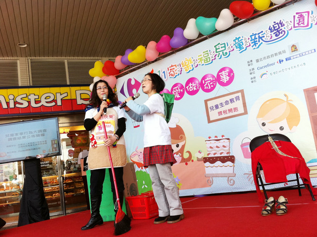 永定國小汪素娥校長(右)和孩子上台分享在家裡幫忙做家事經驗