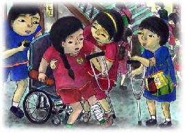 今年在生命教育繪畫比賽「我幫朋友做的一件事」中獲得優選、高雄市陽明國小六年級的呂品嫻,畫下她幫助受傷同學推輪椅的場景。