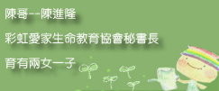 我太太很關心我的健康,會主動發維他命給我,對於我所從事社會公益活動,他十分關心;他關心我所關心的事,這讓我很被支持。他也注意到孩子需要有健康的父親形象,因此,在孩子面前總是不忘為我建立尊嚴與形象,讓孩子以我為榮。這是他對我表達愛意的方式。